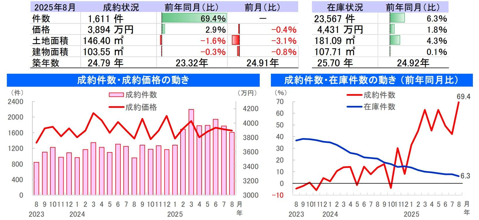 成約価格は、3894万円で前年同月比2.9%増と2カ月連続で上昇した。土地面積は、同1.6%減と2カ月ぶりに縮小。建物面積は、同0.3%減とほぼ横ばいながら2カ月ぶりに縮小した。在庫件数は、同6.3%増と22年9月から36カ月連続で増加するも、増加率の縮小が続いている。