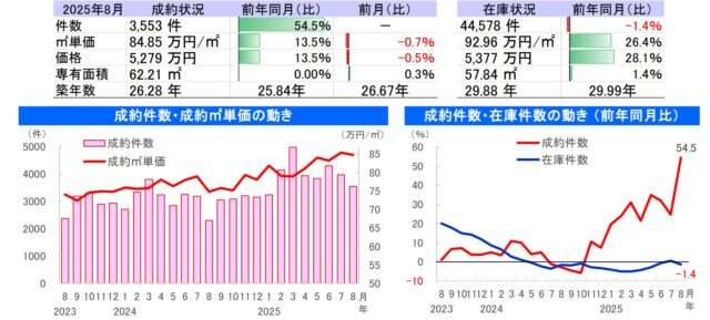 東日本不動産流通機構(東日本レインズ)が9月10日に公表した、首都圏における8月度の中古住宅市場は、戸建て住宅が成約・在庫件数ともに増加した。成約価格も上昇した。一方、マンションは、成約件数は増加、在庫件数は2カ月ぶりの減少となった。成約平米単価は64カ月連続で上昇している。