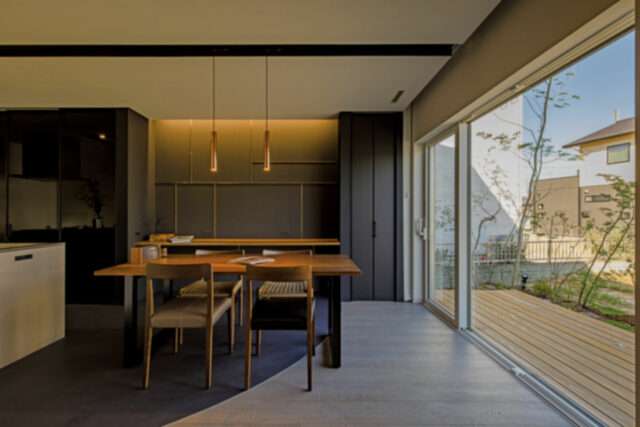 ウッドデッキや庭とつながるダイニング。中桐さんがコンセプトに掲げるモダニズム建築と自然との融合を象徴する空間だ