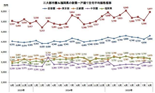 東京カンテイ(東京都品川区)は9月9日、主要都市における8月の新築一戸建て(土地面積100㎡以上300㎡以下)の平均価格動向を発表した。