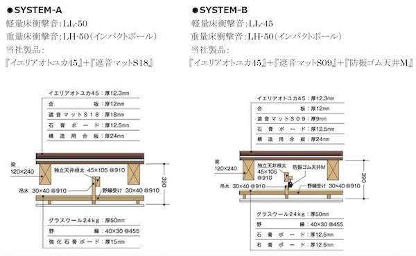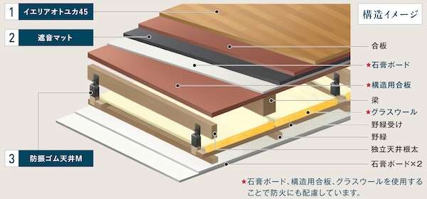 石膏ボードや構造用合板などの建物の構造と、同社製の直張防音床材「イエリアオトユカ45」、床下地材「遮音マットS09/S18」、防音用施工部材「防振ゴム天井M」を組み合わせることで、木造アパートの下階に伝わる床衝撃音を軽減。