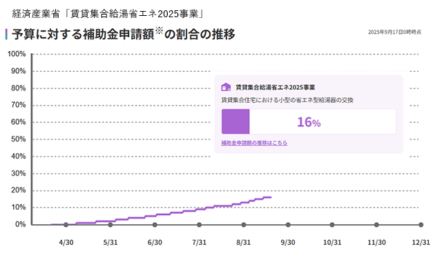 なお、「賃貸集合給湯省エネ2025事業」の年間予算に対する補助金申請額は、9月17日時点で16%にとどまっており、戸建て住宅(新築・既存)を対象とした事業(申請割合:同59%)と比較して活用が進んでいない。