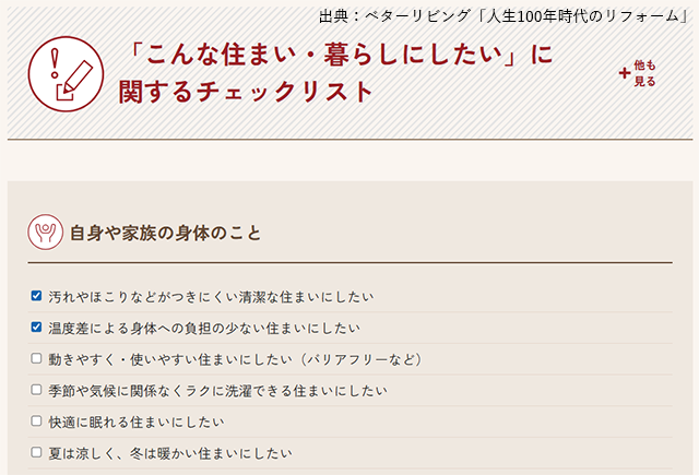 ベターリビング(東京都千代田)は9月11日、人と住宅の長寿命化を見据えた住宅設備・建材の検索サイト「人生100年時代のリフォーム応援ナビサイト」に、具体的な悩みや要望から製品が探せる「チェックリスト検索」機能を追加した。チェックリストに回答することで、希望を満たす製品の一覧が確認できる。
