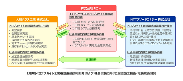リコーは、複合機の開発で培った技術をもとに、ペロブスカイト太陽電池の高変換効率化・高耐久化に加え、高生産性・低コスト化を目指す。大和ハウス工業は、多様な施設での環境配慮型設備の導入技術を活かし、大型物流倉庫の屋根やデータセンターの外壁などへの施工技術を開発し、さまざまな建築物への実装提案を行う。NTTアノードエナジーは、これまで蓄積してきた電装設計に関するエンジニアリング技術などを活かし、モジュール劣化低減に資する設計技術や、独自のパワーコンディショナを開発。曲面屋根や壁面に導入する際に生じる不均等日射による発電量の低下などを解決する。