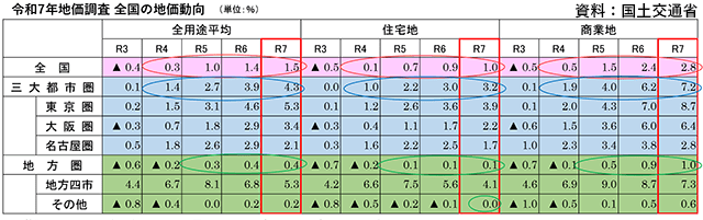 三大都市圏では、全用途平均で+4.3%、住宅地で+3.2%、商業地で+7.2%といずれも大幅に上昇。東京・大阪圏で上昇幅が拡大した一方で、名古屋圏ではやや縮小した。地方圏でも全用途平均で+0.4%、住宅地で+0.1%、商業地で+1.0%上昇したが、上昇率は緩やかとなっている。