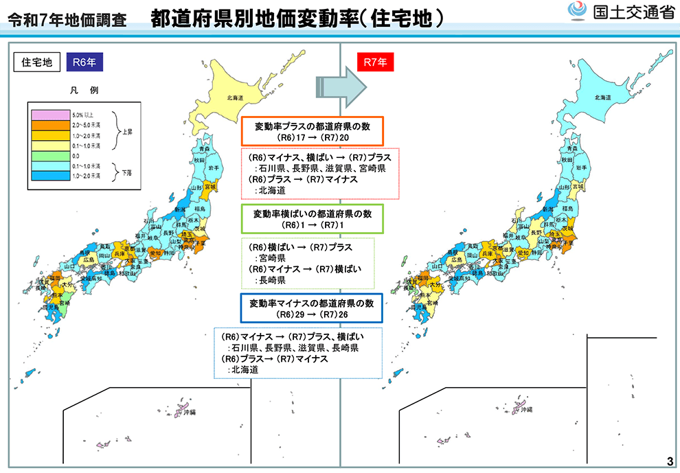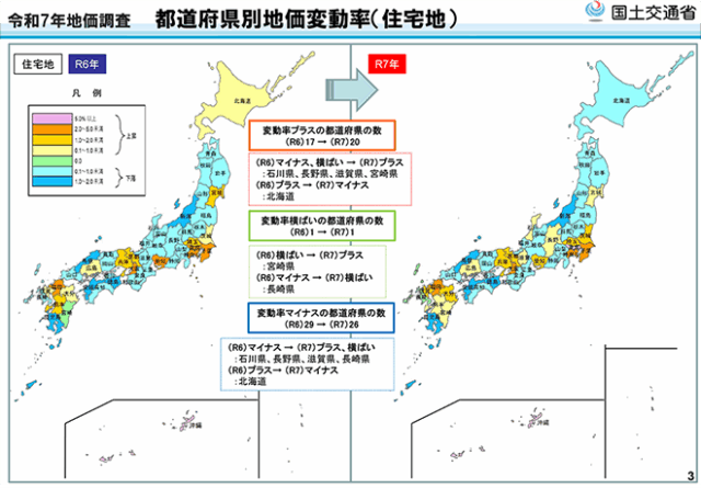 都道府県別では、石川県、滋賀県、宮崎県が前年のマイナスからプラスに転換。北海道がプラスからマイナスに転じている。ただし、大手半導体メーカーの工場が進出した地域では、住宅地・商業地・工業地とも上昇している。