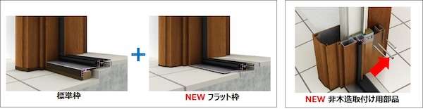 さらに、非防火仕様の「ドアリモ 玄関ドア D30 断熱ドア」と基本構造を統一。リフォーム適齢期を迎える2000年以降に建てられた住宅に多い玄関ドアの下枠と玄関ポーチとの段差がないフラット納まりに対応する「フラット枠」や、非木造住宅への取り付けを可能にする専用のオプション部品を追加した。
