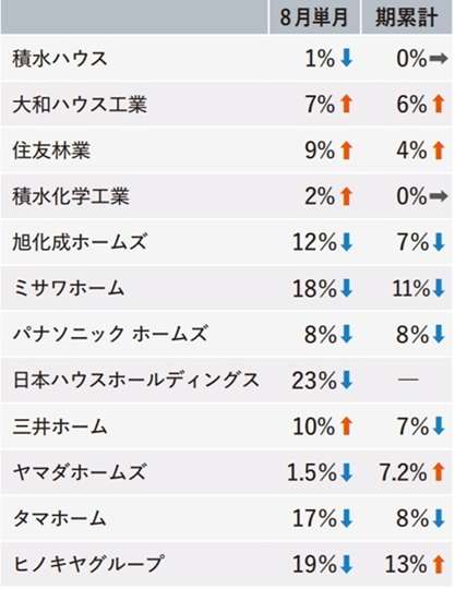 一方、受注減は8社に上り、旭化成ホームズとヒノキヤグループは前月の2ケタ増から一転して2ケタ減に。ミサワホーム、日本ハウスホールディングス、タマホームも2ケタの減少となった。