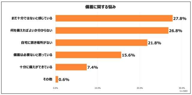 備蓄の内容は「水や食料品」(53.6%)が最多だが、段ボールやケース単位での保管が必要なため自宅収納を圧迫している実態が浮き彫りとなった。実際に「置き場所がない」と回答した人は21.8%を占め、行動を阻む大きな要因となっていることがわかった(下グラフ)。