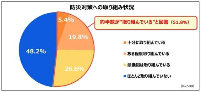 調査によると、防災の必要性を「強く感じている」「やや感じている」と答えた人は全体の約67%にのぼる一方、実際に十分な備えをしている人は25%程度にとどまった(下グラフ)。