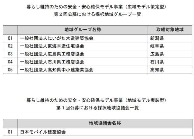 本モデル事業は、地方公共団体と締結する災害協定等に基づき、一定の地域内で連携する住宅生産事業者グループによる災害対応の準備を支援するもの。今回募集が行われていたのは「広域モデル策定型」と「地域モデル実装型」の2種類だった。