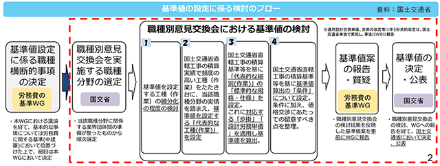素案によると、労務費の水準は適正な賃金原資を確保するため、1日8時間当たりの労務単価となる公共工事設計労務単価に、工事に従事する者の総労働時間(作業日数の総和)を乗じた額を基本とする。さらに作業内容や施工条件などを踏まえて個別に補正を行い、労務費を算出する。