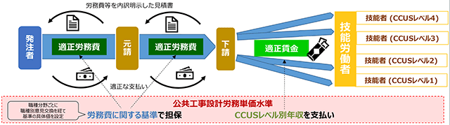 下流(受注者)から上流(発注者)への積み上げにより価格が決まる環境構造の構築や、CCUSレベル別年収の支払いの推進、建設Gメンによる不当に低い見積りへの指導監督の強化なども進める。これにより、賃金を原資とする低価格競争を抑制し、技能者の処遇改善に取り組む事業者が不利にならない環境を目指す。