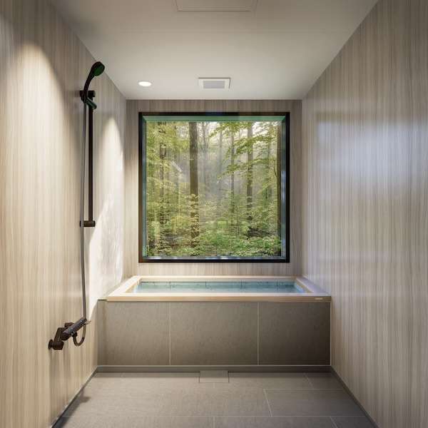 直線的で洗練されたフォルムとし、檜と十和田石を組み合わせた浴槽を標準仕様にすることで、贅沢な素材感を価格を抑えて実現した。