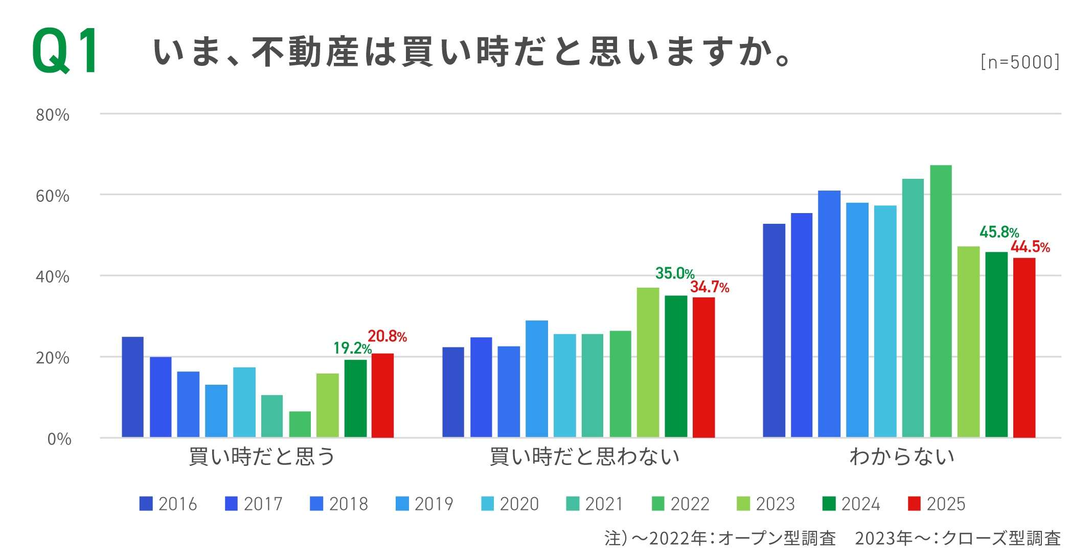 初めに「今は不動産の買い時だと思うか」質問した。「買い時だと思う」と回答した人は20.8%で前年より1.6ポイント増加。その理由としては「今後、住宅ローンの金利が上昇しそうだから」という回答が最多だった。一方、「そうは思わない」と回答した人は全体の34.7%。「そうは思わない」と回答した人の理由としては、「価格が高騰しすぎて手が届かない」がおよそ半数(49.3%)を占め、価格上昇が購買意欲を抑制する最大の要因となっている。