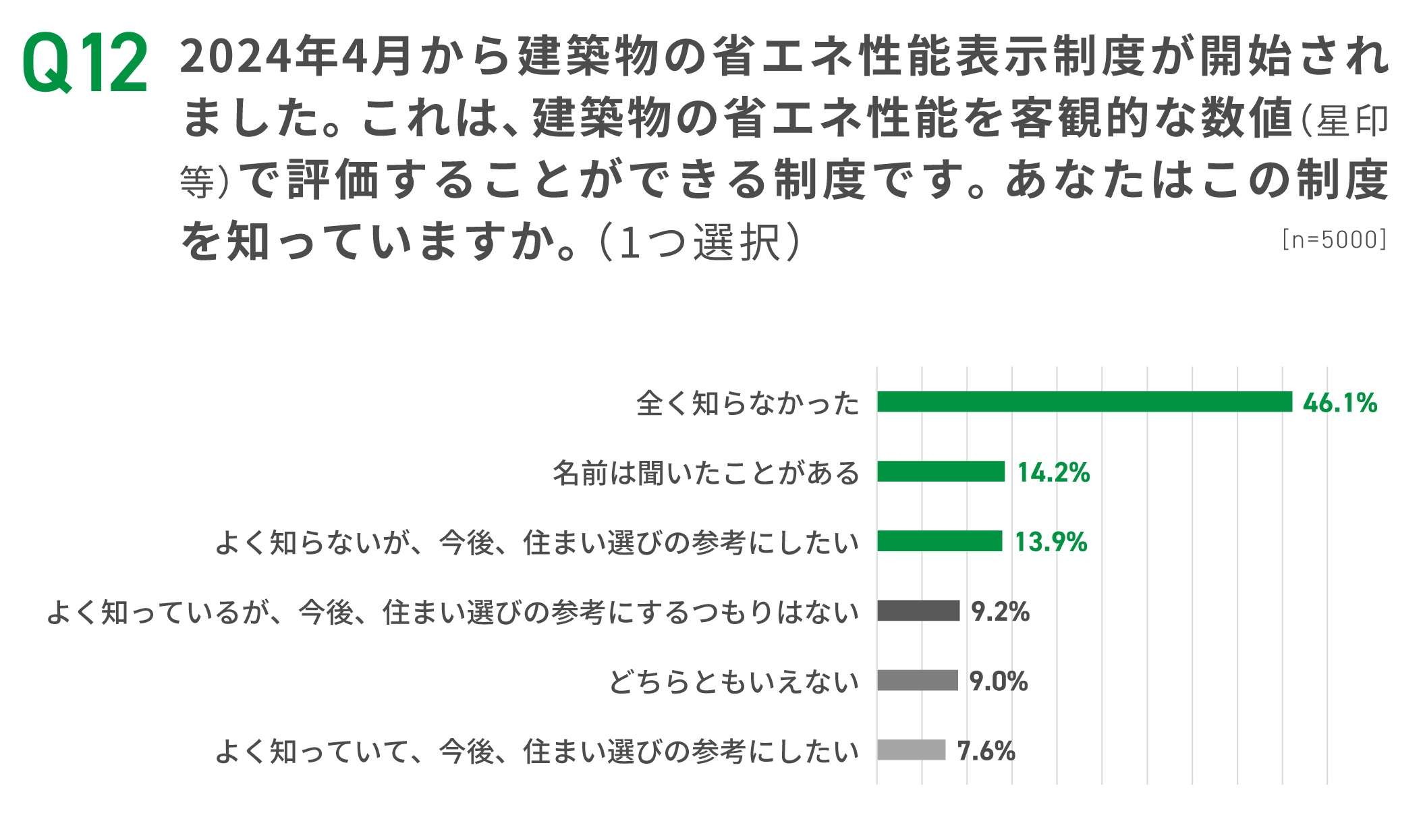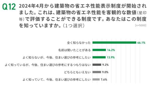 2024年4月に開始された建築物の省エネ性能表示制度については46.1%が「全く知らなかった」と回答、認知度が低いことが明らかになった。一方、「よく知らないが、今後、住まい選びの参考にしたい」(13.9%)、「よく知っていて、今後、住まい選びの参考にしたい」(7.6%)の計21.5%は「今後参考にしたい」と回答。制度の活動意欲は一定程度存在している形だ。