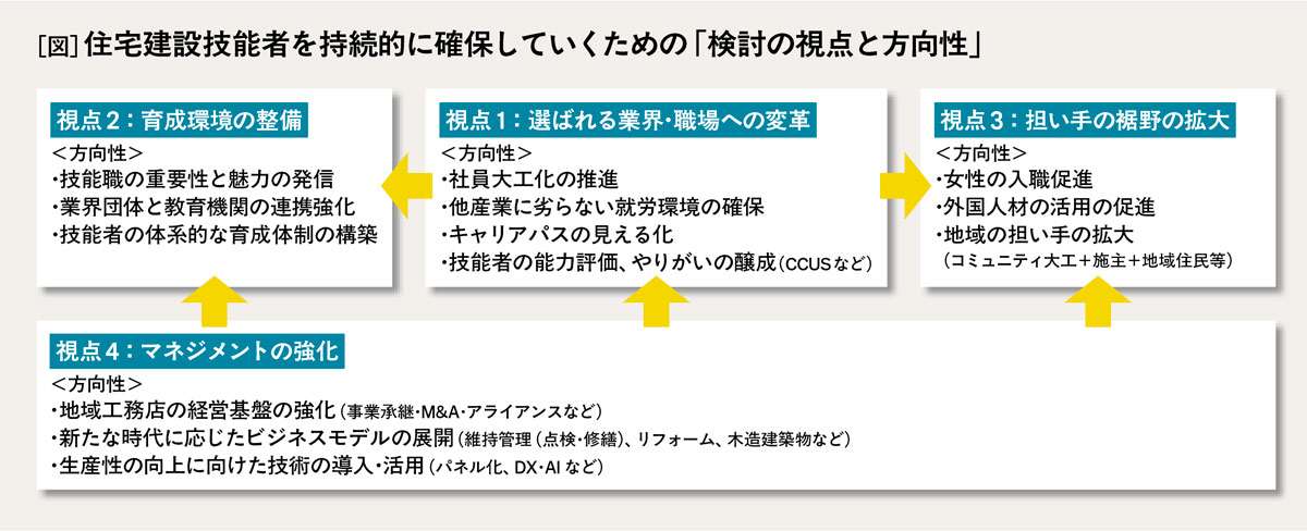 国土交通省の「住宅分野における建設技能者の持続的確保懇談会」(座長=蟹澤宏剛・芝浦工業大学教授)は9月5日の会議で、中間とりまとめの案を提示した。急激な減少・高齢化が進む大工・職人の現状を踏まえ、今後の施策の方向性を、業界・職場環境の変革、育成環境の整備、担い手の裾野拡大、マネジメントの強化の4つの視点で整理。具体的な施策の方向性として、社員大工化の推進や、体系的な育成体制構築などを挙げた[図]。