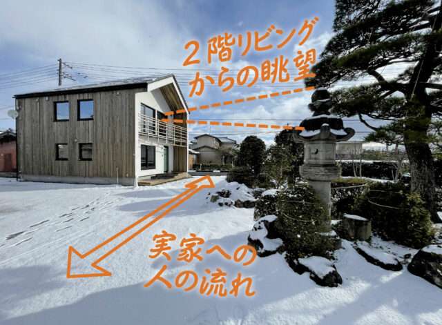 今回の事例は、サトウ工務店(新潟県三条市)とのコラボ物件です。お施主さんは実家の敷地の一部を譲り受け、そちらに新築を建てるというパターンでした。お施主さんからは「敷地内にある広い庭を眺めたい」といった要望がありました。私としては立派な庭を眺めるための開放的なプランを提案したかったのですが、ご実家の来客が庭と住まいの間を何度も行き来するため視線が気になりました。この問題を解消するため、2階リビングにバルコニーを設けた提案をしました[写真1]。