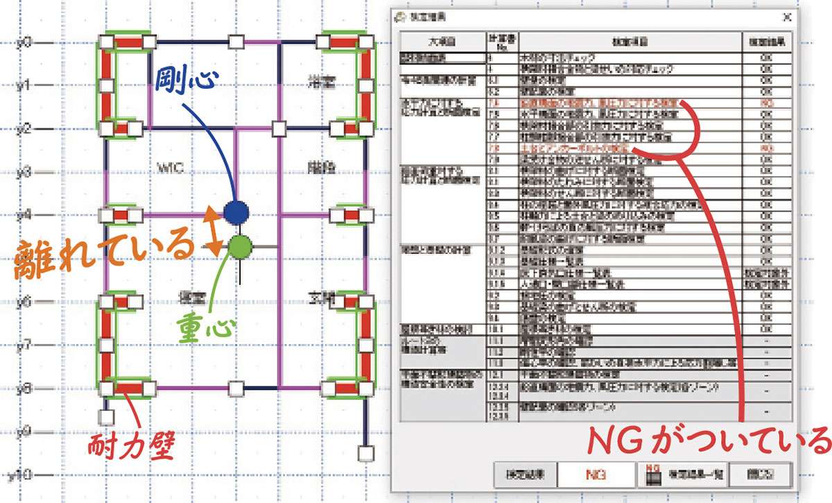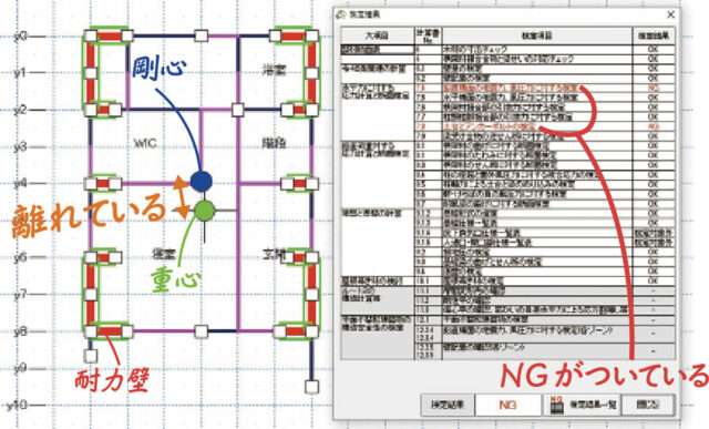 この場合、耐力壁を増やせばNGを解消できます。しかし、南側バルコニーの存在が重心と剛心※の大きなズレにつながっており、壁量不足よりも偏心率の悪さがNGの直接的な原因ではないかと私は読みました[図1]。