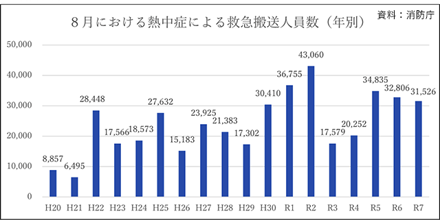 総務省消防庁がこのほど発表した8月の「熱中症による救急搬送状況」(PDF)によると、全国における熱中症の救急搬送数は3万1526人となり、昨年同月の3万2806人から1280人減少した。月別の調査を開始した2008年以降で、5番目に多い水準となっている。