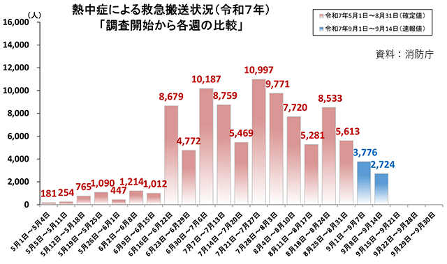 一方、9月(1~14日)の搬送者は6500人で、最高気温の低下とともに減少傾向にある。参考として、ここ数年の9月の搬送者は2024年が1万1503人、2023年は9193人、2022年は4931人となっている。