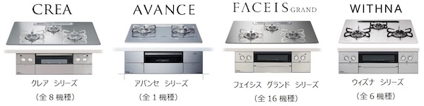 厨房機器としてビルトインコンロ「クレア」「アバンセ」「フェイシスグランド」「ウィズナ」をラインアップ。