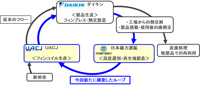 日本磁力選鉱(福岡県北九州市)、ダイキン工業(大阪市)、UACJ(東京都千代田区)はこのほど、空調機用熱交換器の水平リサイクル技術を共同で実証したと発表した。