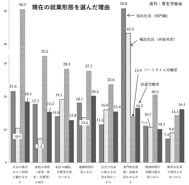 建設業にも多い雇用形態では、「パートタイム労働者」は「自分の都合のよい時間に働けるから」(50.5%)、「嘱託社員 (再雇用者)」は「専門的な資格・技能を活かせるから」(43.3%)、「派遣労働者」は「正社員として働ける会社がなかったから」(33.3%)との回答が最多となった。