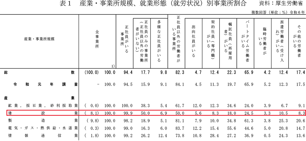 厚生労働省が9月26日公表した2024年の「就業形態の多様化に関する総合実態調査」結果によると、「正社員以外の労働者がいる事業所」の割合は、全産業平均の82.3%に対し、建設業では50.0%となった。「正社員がいる」は99.9%(全産業平均94.4%)、「正社員のみ(正社員以外はいない)」は50.0%(同17.7%)だった。