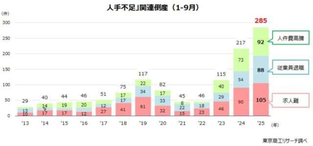 東京商工リサーチ(東京都千代田区)が10月3日に発表した「人手不足」関連倒産の調査結果によると、今年9月に「人手不足」が一因となった倒産は、調査を開始した2013年以降では月間最多の46件(前年同月比109.0%増)となった。また、2025年1月から9月の累計も、過去最多の285件(前年同期比31.3%増)に達し、人手不足はより深刻さを増していることがわかった。