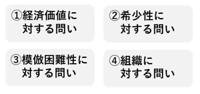 バーニー氏は、企業が競争優位を保てるかどうかは保有資源と活用能力によるとし、4つの問いを提示しました。頭文字をとって「VRIO(ヴリオ)」と呼ばれます。