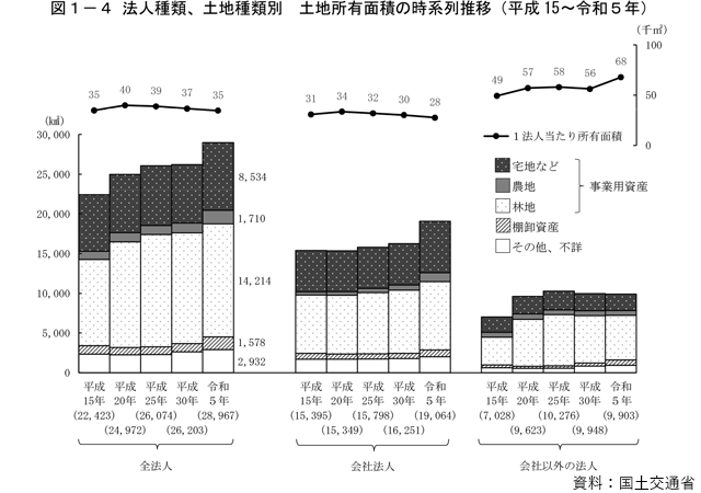 国土交通省は9月30日、2023年に実施した「法人土地基本調査」(PDF)の確報集計を取りまとめて公表した。これによると、23年1月1日時点で法人が所有している土地の面積は2万8967㎢で、このうち「宅地など」は全体の29.5%に当たる8534㎢となった。最も面積が広い「林地」は1万4214㎢(49.1%)。※カッコ内は構成比