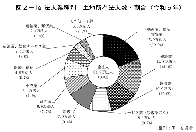 土地を所有する法人を業種別にみると、「不動産業、物品賃貸業」が15.9万法人(19.0%)で最も多く、次いで「建設業」が12.8万法人(15.4%)、「製造業」が10.0万法人(12.0%)と続いた。これらの3業種で全体の約半数を占めている。一方、所有面積は「製造業」の4274㎢(14.8%)が最大で、次いで「林業」4012㎢(13.8%)、「サービス業」3761㎢(13.0%)の順となった。
