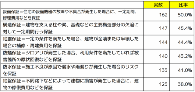 新築時に重視する保証内容としては、設備保証(50.0%)や構造保証(45.4%)、地震保証(44.4%)などが上位を占める。また防蟻や防水、地盤保証も4割前後となった。