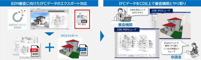 最新版では、同社のBIMソフト「GLOOBE」で培った技術を生かし、BIM図面審査への対応を強化。IFC出力により、立体モデルを審査機関とCDE(共通データ環境)で共有でき、図面だけでは伝わりにくい情報も補完。よりスムーズな審査を可能にする。