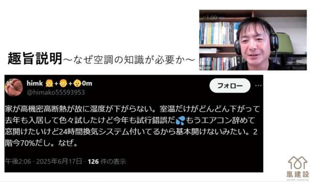 9月26日にはオンラインで事前説明会が開かれ、全国から計88人が参加した。森氏は「湿度が下がらない」「結露が生じる」など、施主がSNSで発信する事例を引用しながら、「顧客のリテラシーが高まるなかで、プロが知識や技術で劣れば存在価値はない」と工務店が空調設計力を高める必要性を強調。その上で、本塾の目的として「湿気や暑さ寒さに関するクレームをなくすこと」を掲げた。