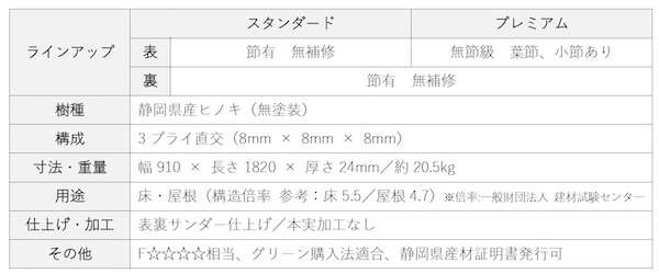 幅910×長さ1820×厚さ24mm。厚さ36mm以下のためJAS規格外。グリーン購入法適合品。