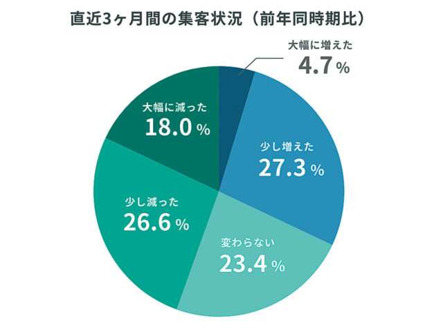 直近3カ月間の集客状況は、前年同時期比で「大幅に減った」が18.0%、「少し減った」は26.6%と、4割以上が減少したと回答。「変わらない」も23.4%を占めた。
