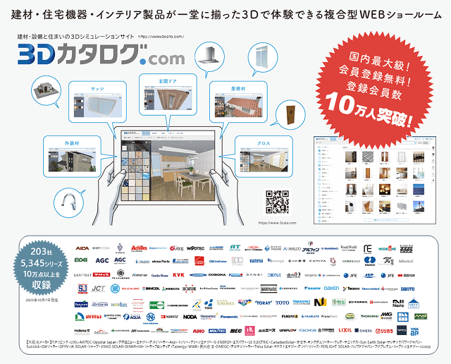「3Dカタログ.com」は、メーカー203社・5345シリーズ・10万点以上の建材・住宅機器・インテリア製品を収録し、WEB上でシミュレーションできる複合型WEBショールーム。国内最大級のカタログプラットフォームとして、建設のプロおよび家づくりを検討中の人に活用されている。