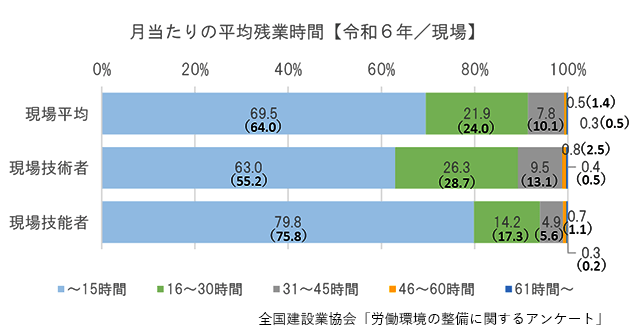月当たりの平均残業時間は、現場・事務所ともに「15時間未満」が最多だったが、現場の方が長時間となる傾向が見られた。さらに、技能者よりも技術者の方が平均的に労働時間は長くなっている。