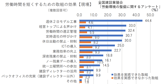 労働時間を短くするための取り組みとその効果については、現場では「週休2日モデル工事」「労働時間の適正管理」「定時退社の呼びかけ」「経営トップによる声かけ」などを実施した企業が多く、その大半が取り組みの効果を「実感できた」と回答している。