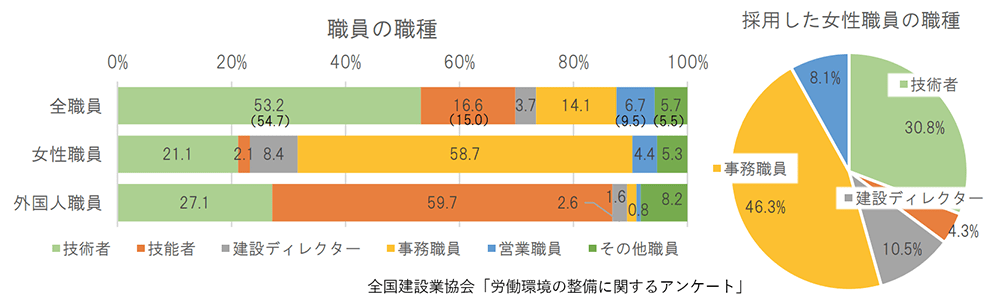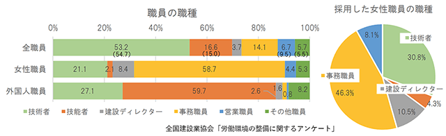 職員の職種の構成は、全職種では「技術者」が53.2%で最多となったが、女性職員に限ると「事務職員」が58.7%で最多となっている。女性職員に占める「技術者」の割合は21.1%、「技能者」は2.1%、技術者をバックオフィスで支える「建設ディレクター」は8.4%。採用した女性職員の職種も「事務員」が46.3%で最も多く、次いで「技術者」(30.8%)、「建設ディレクター」(10.5%)の順となった。