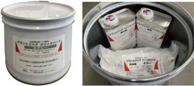 施工目安約2.9L/セット。梱包内容5kg/缶セット(基剤1kg、硬化剤1kg、紛体部3kg)。施工厚1~20mm。