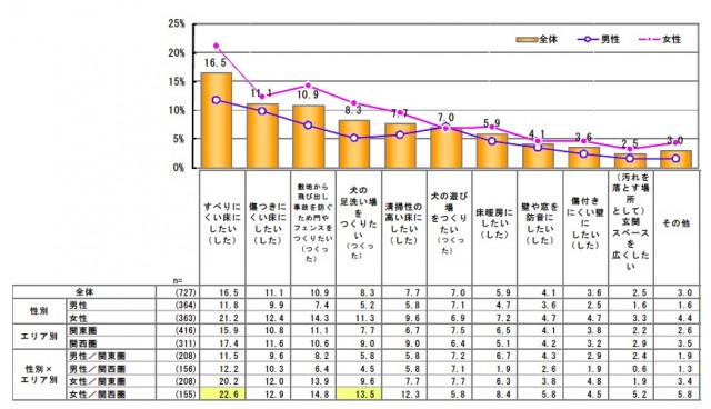 犬のための住宅リフォーム意向については、36.9%が「したい(した)」と答えた。希望のリフォームは「滑りにくい床にしたい(した)」「傷つきにくい床にしたい(した)」「敷地から飛び出し事故を防ぐための門やフェンスをつくりたい(つくった)」が上位にあがった。