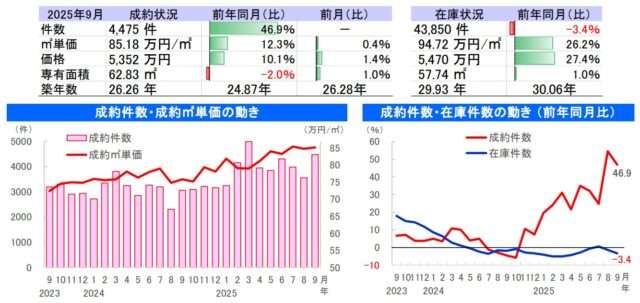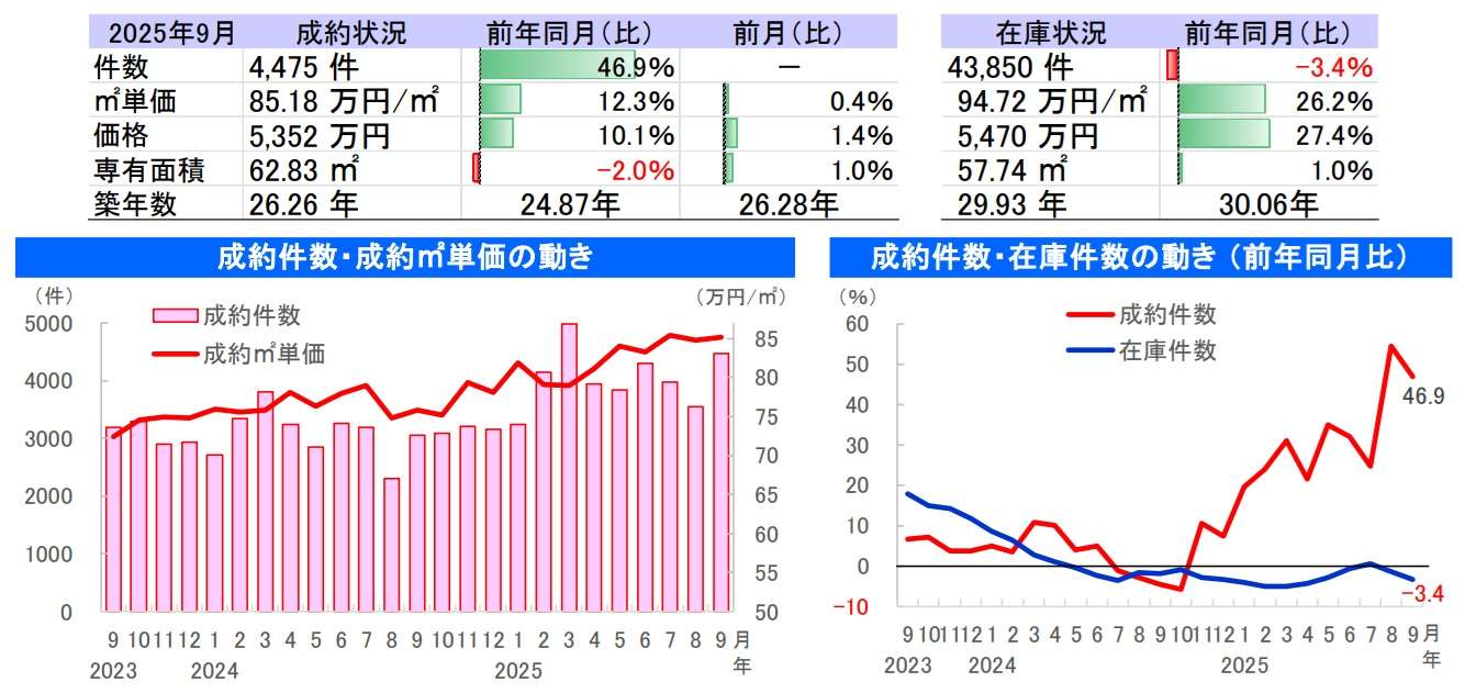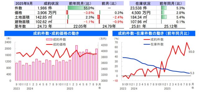 東日本不動産流通機構(東日本レインズ)が10月10日に公表した、首都圏における2025年9月度の中古住宅市場は、成約・在庫件数ともに増加が続くなか、中古戸建て住宅の成約価格が3ヶ月ぶりに下落した。一方、マンションは、成約平米単価が65ヶ月連続で上昇。在庫件数は2ヶ月連続で減少した。