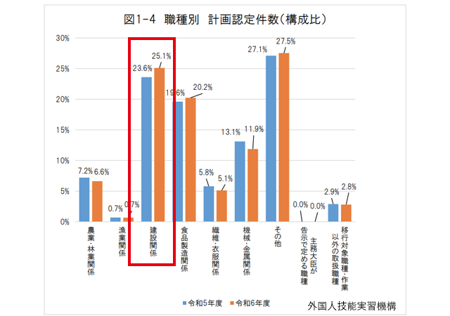 外国人技能実習機構が10月7日公表した2024年度の「外国人技能実習機構業務統計」によると、同年度に認定を受けた「技能実習計画」の件数は31万8572件で、前年度から3万1454件減少した。同計画の認定数を職業別にみると、建設関係の職種(塗装を除く)が最多で25.1%を占めた。