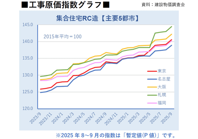 集合住宅(RC造)の建築費指数は、工事原価でみると140.6(暫定値)となり、前月比で1.0%、前年同月比で4.9%増加。純工事費でみると142.0(暫定値)となり前月比1.1%、前年同月比で5.0%の増加となった。