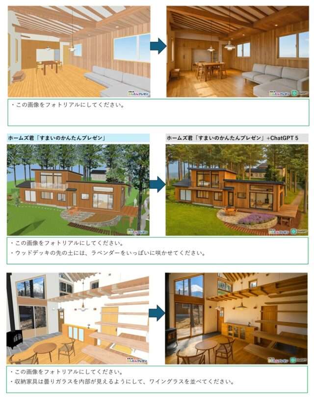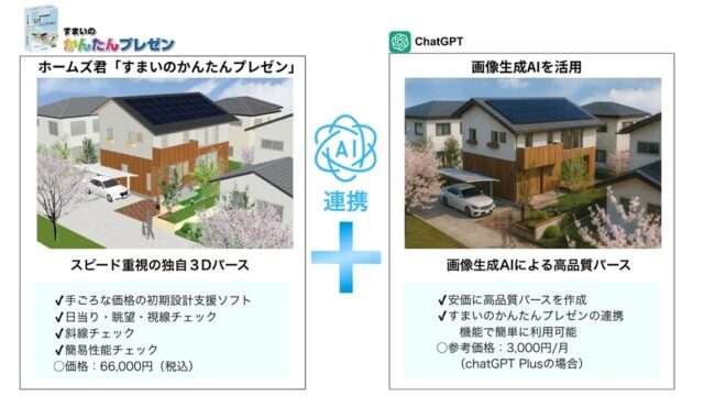 例えば個人向け有料プラン「ChatGPT Plus」を利用した場合、月額約3000円(20USドル)かかるが、100万円前後する従来ソフトと比べると、「ホームズ君 すまいのかんたんプレゼン」(6万6000円)とあわせても安価にフォトリアルな建築パース作成が可能になる。