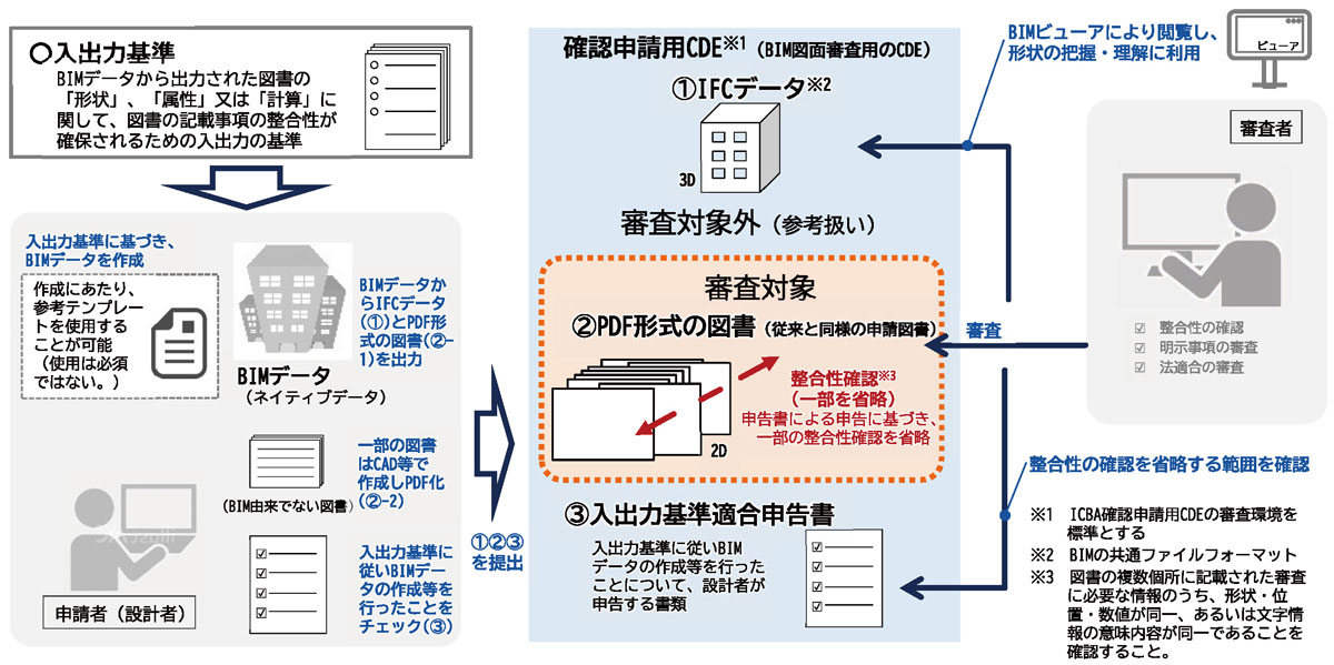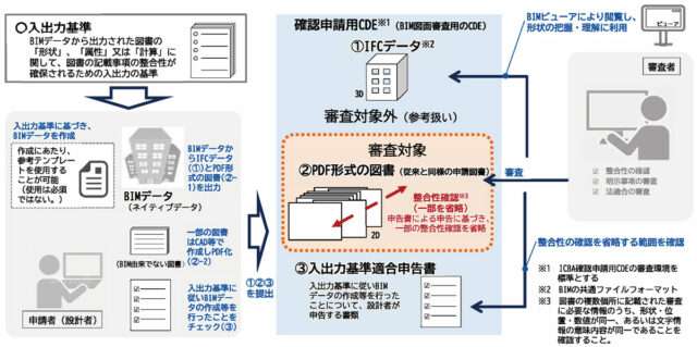まずは2026年春から始まるBIM図面審査について知ろう。申請者がBIMのデータを作成し、IFCというオープンフォーマットのBIMデータと、設計図書(PDF)を出力。この2つを審査機関に提出する。BIM由来ではない図書はこれまで通りCADから出力する。図面審査の段階では、審査対象はあくまで設計図書のみ。BIMデータは、審査者が形状を把握する参考にはするが、それ自体が審査対象とはならない[図1]。