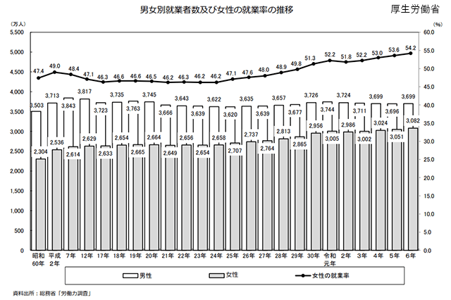厚生労働省がこのほど公表した2024年度の「働く女性の実情」によると、同年度の女性の労働力人口は3157万人で、前年度から約33万人増加した。男性は3800万人で約1万人減少している。労働力人口総数に占める女性の割合は45.4%で、前年から0.3ポイント上昇した。一方、建設業で働く女性は78万人で前年比では横ばい。男性の就業者が前年度から4万人減少していることから、構成比は19.4%となり、前年度比で0.2ポイント増加した。